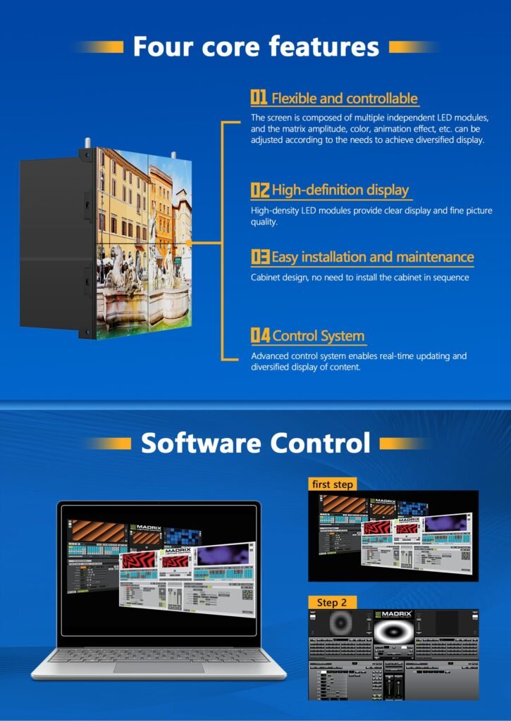 The screen consists of multiple independent LED modules, allowing full adjustment of matrix resolution, color, and animation effects for versatile, dynamic displays. High-density modules deliver sharp, high-definition visuals with fine image quality. Modular cabinet design eliminates sequential installation constraints, while the advanced control system enables real-time content updates and multi-format display capabilities.